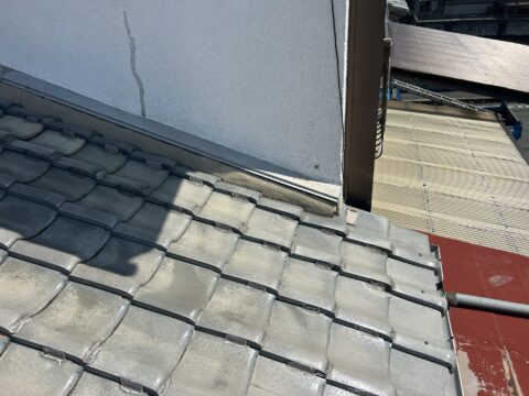 2階壁際の既存瓦葺き直し工事(防水紙、瓦桟木、捨て谷板金は新規材料使用)